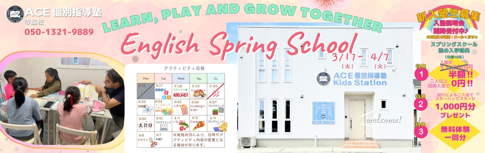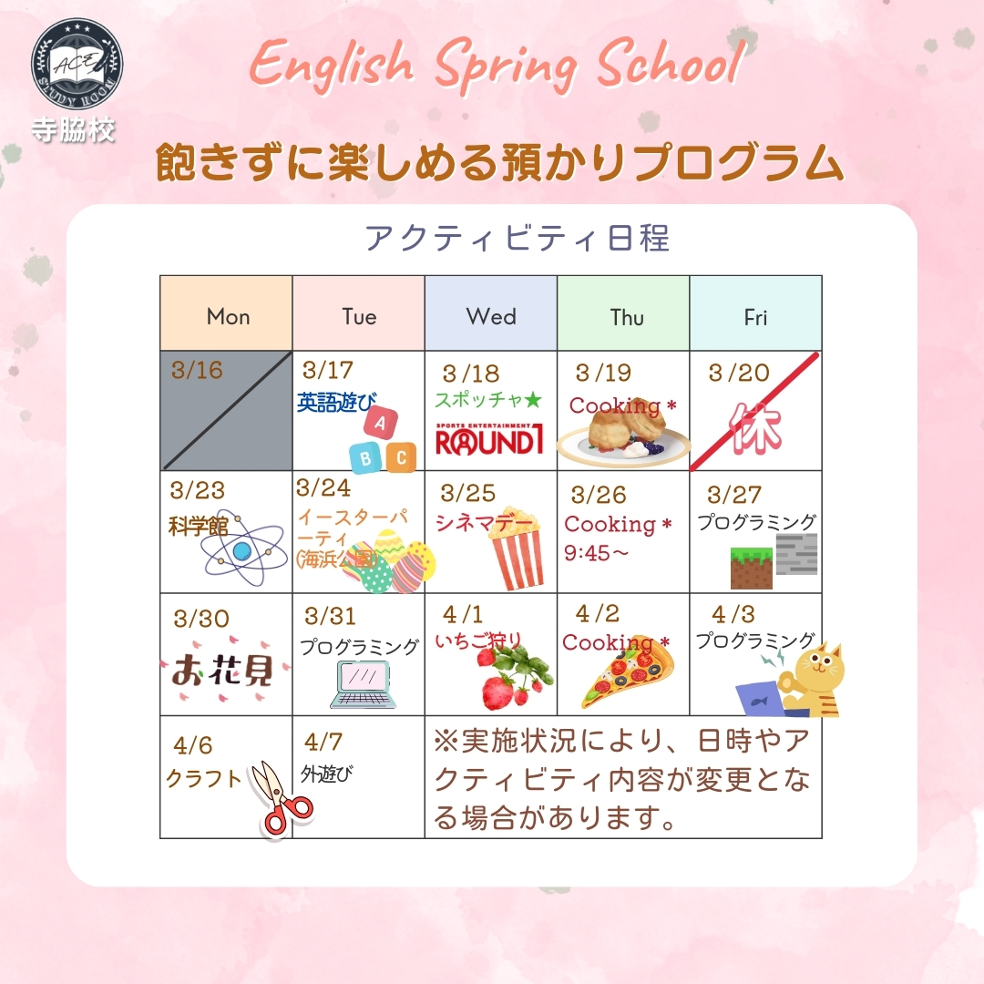 預かり 英語を学べる預かりサポートです。学校の宿題だけでなく、英語の日常会話・体験学習・SDGs学習に取組んでいます。 幼児クラス 美文字ひらがなの書き方、算数のおけいこをし入学準備をしていきます。 小学生クラス 教科書準拠テキストを使用し、学校の定期テスト対策をします。個人レベルに合わせて指導します。